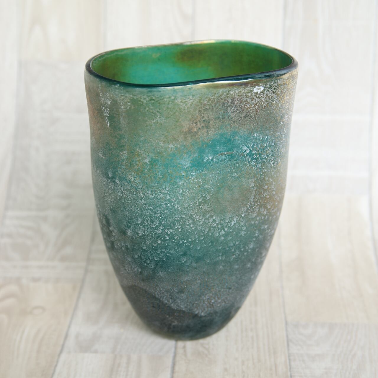 七色の輝きを放つ表面仕上げが特徴的なガラスベース。手作りのため一つ一つが異なる表情を持ち、工芸的な美しさと趣を感じさせます。口元をオーバルにすることで花がまとまり易く、奥行きの狭い棚にも飾って頂けます。