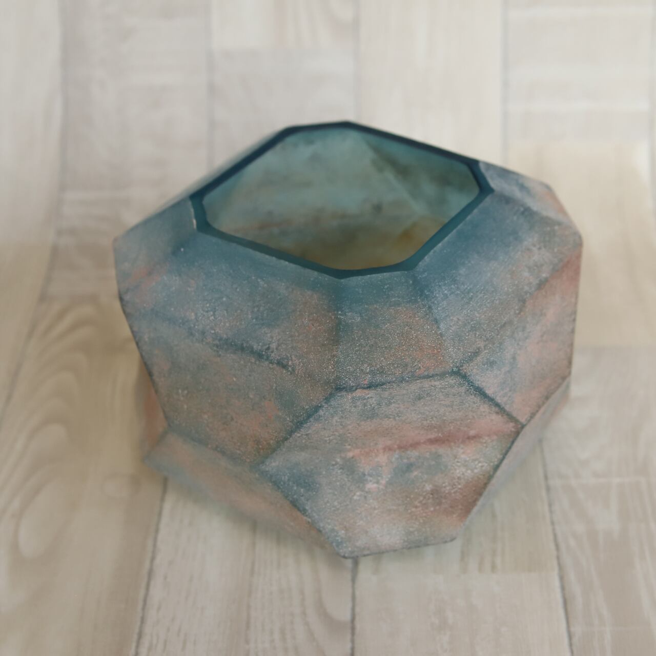 メタリックブルーの多面体が複雑に光を反射する様は、サファイヤの原石を彷彿とさせます。飾る向き、置き方により様々なアレンジの仕方を提案できるベースです。