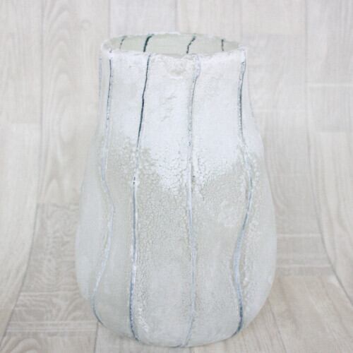 濃紺のストライプがアクセントになり、シンプルでありながら優しい存在感のあるベースです。表面をフロスト処理することで半透明になり、生けた花の繊細なニュアンスを伝えます。形状が一つ一つ微妙に異なりますが、手作りによる個性とご理解下さい。