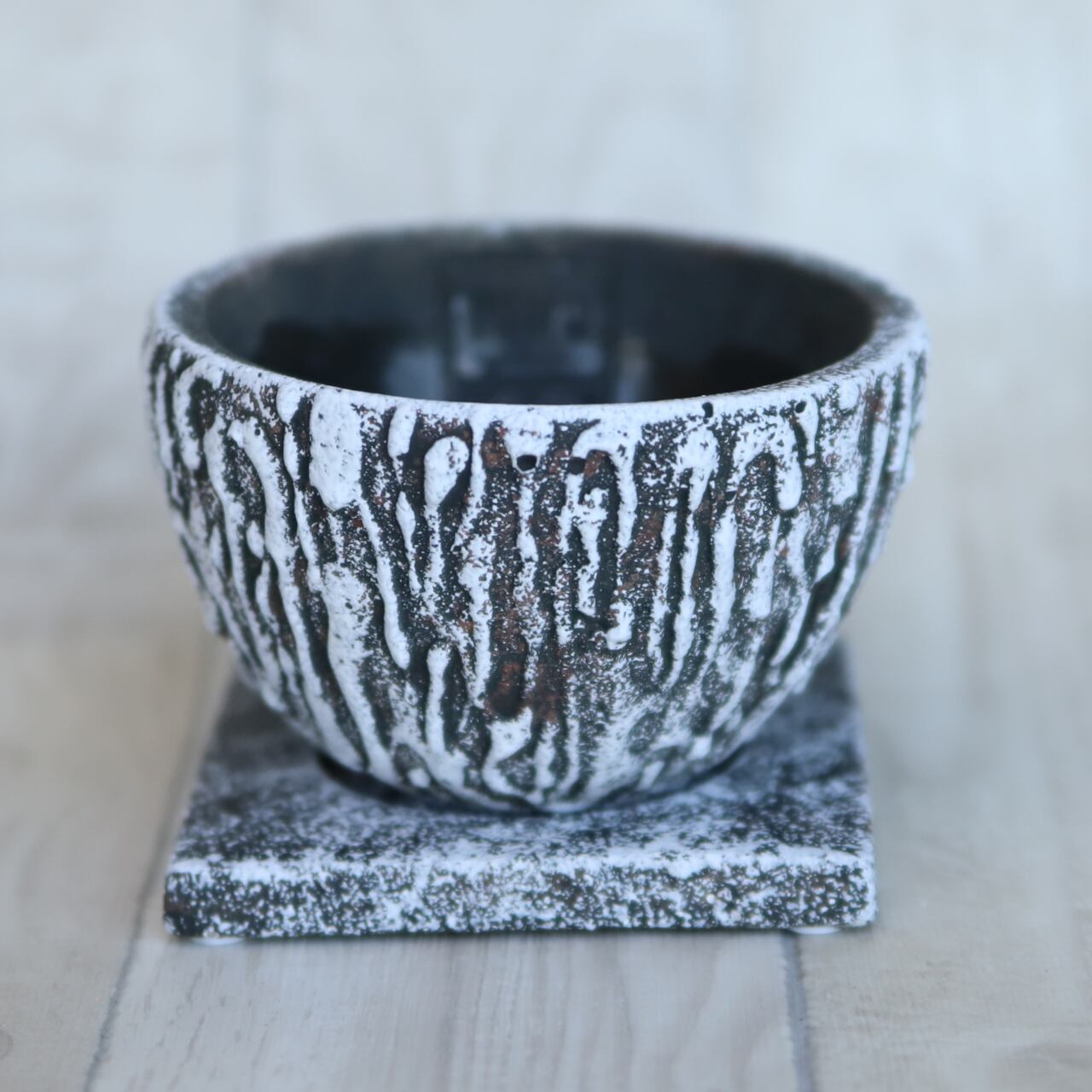 和にも洋にも映えるデザインのインテリアポット。有機的なレリーフが植物の存在感を高め、スクエアにデザインされた受け皿は凛として全体の表情を引き締めます。(穴あき、皿付き)
