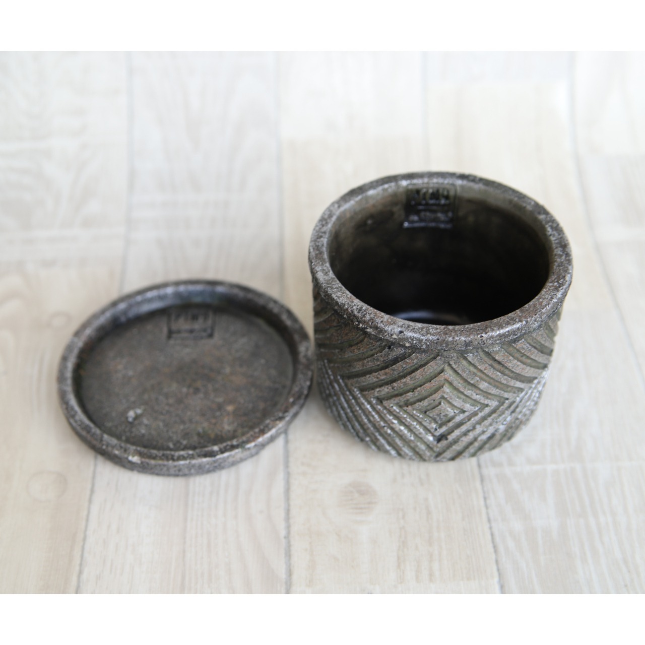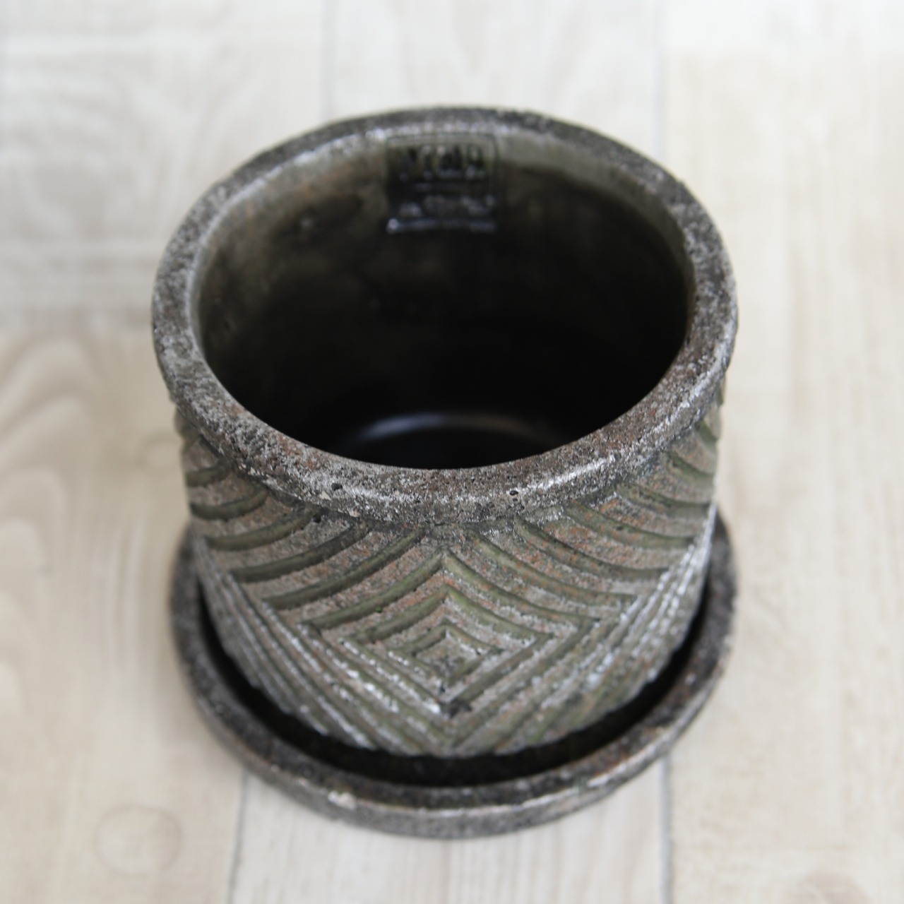 PTMD collection が提案するインドアグリーン向けのセメントポットシリーズ。植物の個性を引き立て、上質なインテリアプランツに仕上がります。幾何学的なデザインでありながら手彫りしたレリーフの線がぬくもりを残します。(穴あき、皿付き)