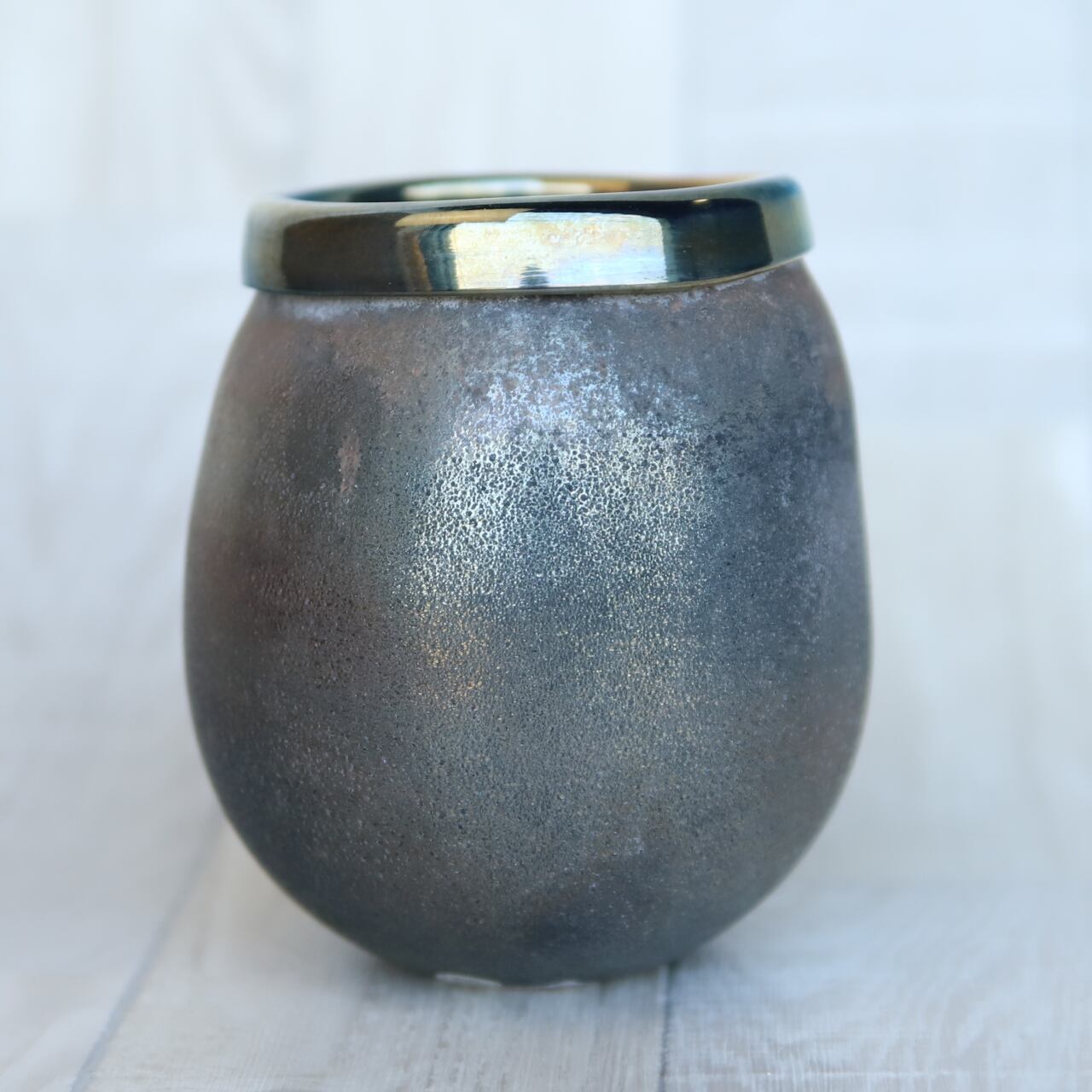 マットなボディと光沢を持った口元リムの仕上げが、絶妙なコントラストを織りなすブーケホルダー。ハードなテクスチャーを丸みのあるフォルムが中和します。